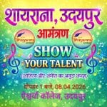 उदयपुर। ‘शायराना उदयपुर’ परिवार द्वारा आगामी 8 अप्रैल, बुधवार को शोभागपुरा स्थित ऐश्वर्या कॉलेज में संभागीय स्तर का साहित्यकार, कवि, शायर और लेखक मिलन समारोह आयोजित किया जाएगा। दोपहर 1 बजे से शुरू होने वाले इस ‘साहित्य स्पेशल’ कार्यक्रम में कोई भी इच्छुक साहित्य प्रेमी अपनी रचनाओं की निःशुल्क प्रस्तुति…